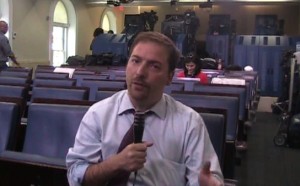 As a quick side-note, one of the fun things about these interviews is watching out for other reporters who wander in and out of the briefing room. In this clip, there are guest appearances by Bloomberg’s Hans Nichols (after the credits), and by Politics Daily’s Patricia Murphy, who’s sitting a few rows behind Chuck.