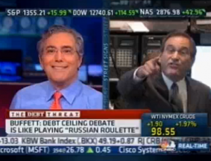 The banner at the start of the CNBC segment reads “What’s the Deal?” And that’s a question some viewers may have asked by the end of the segment after watching CNBC’s Rick Santelli go very nearly grandma-punching crazy in a segment about spending and the debt ceiling. “I don’t believe in compromise on spending,” Santelli shouted. “There’s no compromise. Stop spending.” And from there it got weirder. Referring to a comment from Warren Buffet about the debt ceiling negotiations referring to the negotiations as a game of Russian roulette, Santelli said “there’s a bullet in the gun. If we keep spending, for sure we’re going to hit something and it’s going to bleed!