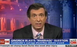 Appearing on CNN’s Newsroom, Howard Kurtz criticized his fellow network colleague John King for his “open marriage” question to Republican hopeful Newt Gingrich at last night’s debate. “I must say that I thought it was a misstep for John King, who is a fair and seasoned and balanced reporter, to make that the very first question of the debate.”