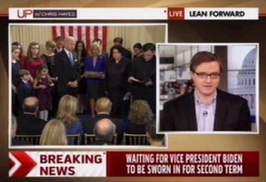 During Vice President Joe Biden‘s early morning inauguration Sunday, the three major political news networks were all buzzing with coverage. The difference is, CNN and Fox carried the entire ceremony, including the invocation with Rev. Kevin O’Brien at the start, while MSNBC anchor Chris Hayes simply talked over it.