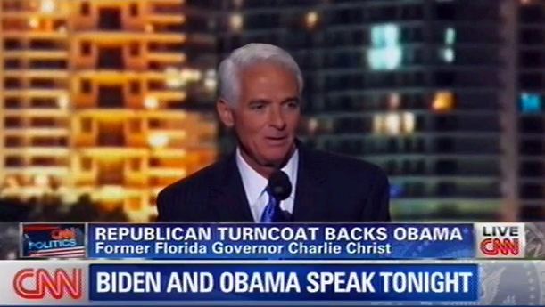 Former Florida Republican governor Charlie Crist spoke at the Democratic National Convention tonight in support of President Obama. Crist was guaranteed to be one of the most notable speakers this week for the simple fact that he used to be a popular Republican governor. Artur Davis, a former Democrat, switched parties recently and got a prominent speaking slot at the RNC last week. Both men have been referred to by their most ardent detractors as “turncoats” from their respective parties.