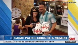 CNN anchor Randi Kaye teased the segment by saying, “Sarah Palin is apparently hungry for chicken and controversy.” Palin stopped at Chick-fil-A to show her support in the midst of national attention on its founder’s anti-gay stance and the chain’s donations to anti-gay groups.