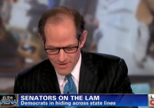 On CNN’s In the Arena, Eliot Spitzer morphed back to his days in the Manhattan District Attorney’s office, donning reading glasses and telling “fugitive” Wisconsin Senator Fred Risser he “poked around your state’s constitution for a few minutes this afternoon.” The senator, who joined the program by phone from an “undisclosed location,” is part of a group of Wisconsin lawmakers who fled the state in an effort to stop Gov. Scott Walker‘s move to end collective bargaining. Those lawmakers now face the possibility of arrest.