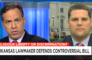 CNN’s Jake Tapper today grilled the sponsor of Arkansas’ religious freedom bill (currently on hold after the governor asked for clarified language) and asked him multiple times if it allows for discrimination or not. And Tapper expressed his confusion multiple times given all the conflicting messaging from supporters of the bill on the matter.