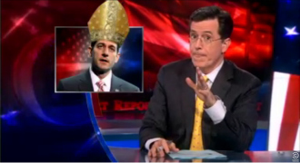 On Tuesday night’s edition of The Colbert Report, Stephen Colbert mock-defended Rep. Paul Ryan‘s (R-WI) budget proposal from the U.S. Conference of Catholic Bishops, who criticized Ryan’s plan as unjust, and from President Obama, who called the budget plan “thinly-veiled social darwinism.”