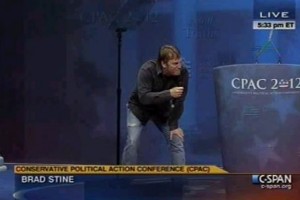 Conservative Christian comedian Brad Stine has been described as “a clean Denis Leary,” which basically means that he YELLS A LOT but only yells words WITHOUT FOUR LETTERS. As such, he was the PERFECT GUY to send CPAC attendees off before the day’s big dinner. To close off HIS SET, he explained that the ONLY THING missing from the conservative movement right now was “the COMEDY FACTOR,” as people like Jon Stewart and Bill Maher were spreading liberal messages far and wide. He told the audience that they needed TO RALLY TOGETHER to spread the truth about the LIBERAL WUSSIFICATION OF AMERICA. Some examples of wussification that Stine attacked were AIR BAGS and CHILDREN’s BIKES THAT AREN’T CLEARLY DESIGNED FOR ONE GENDER OR ANOTHER.