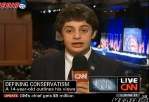 Jonathan Krohn has some heavy ideas for these Republican parts, and he’s even written a book on them, Defining Conservatism. He told CNN reporters today that he considers himself a Conservative Realist, which is someone who bases their ideas in reality, not hyperbole. Which is a word that most kids his age are just learning the meaning of. Meet Jon Krohn, the 14-year old hope for the Conservative Party.