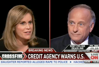 Rep. Steve King (R-IA) found himself stuck between host Stephanie Cutter and his colleage, Rep. Donna Edwards (D-MD) during a heated Crossfire debate over the budget and debt ceiling battles waging in Congress. Cutter challenged King to answer for the “hard-liners” in the House who appear unwilling to reopen the government and raise the debt ceiling. “We’re more than two weeks into this,” Cutter said, “have you learned nothing?”