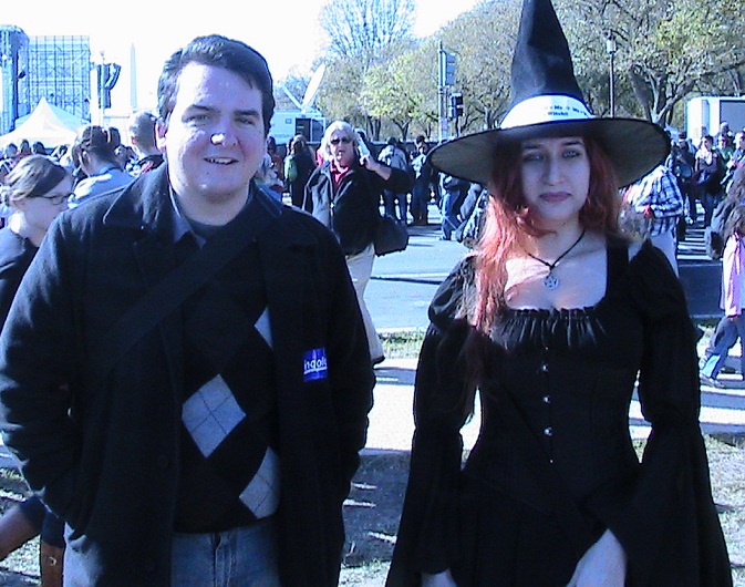 Even so, I managed to get some great pictures, and I ran into a few interesting characters, including Slate’s Dave Weigel, on his day off, and got his thoughts on the rally. As you’ll see, he was a much better interviewee than evangelical Sithian Darth Vader and not-so-super hero Unemployed Man: (Interruptions provided by Redstate’s Ben Howe and Newsbusters’ Steve Gutowski. Sunglasses by Brittany Cohan.)
