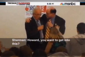 “Howard, you want to get into this?” Sherman asked as he threw his arm about Berman’s shoulder, yanking him toward his chest. The “lunge by the 57-year-old Sherman appeared to startle Berman, who is 71 and smaller in stature, while the audience hooted and shouted,” the Associated Press noted. A law enforcement official stepped between the two.