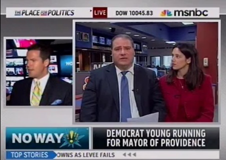 On MSNBC Live this morning, anchor Tom Roberts thought he was introducing an airy bit of news cotton candy in the story of Providence, RI mayoral candidate Chris Young‘s mid-debate marriage proposal to girlfriend Kara Russo. The segment turned awkward in a hurry, though, as Young proceeded to read disjointed talking points off of a crib sheet.