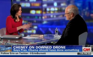 Former Vice-President Dick Cheney appeared as a guest on Erin Burnett OutFront Tuesday night, and hit on topics ranging from what President Barack Obama should have done with the downed drone in Iran to his thoughts on the Arab Spring.