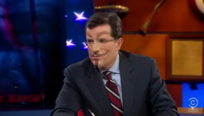 It occurred during and interview with Salon’s Glenn Greenwald, a WikiLeaks supporter who Barr’s security firm attempted to intimidate. Towards the end of the interview, as Greenwald was talking, attentive viewers or people with really nice HD sets could notice that the image of a Guy Fawkes mask flashed over Colbert’s face for less than a second. The Guy Fawkes look is, of course, one that has been used as a symbol for Anonymous as a reference to the book and movie V for Vendetta. (Memo to Glenn Beck: Wael Ghonim also claimed V for Vendetta as an inspiration. Episode linking the uprisings to Anonymous, please).
