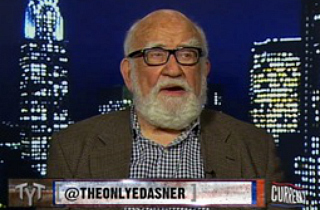 Appearing on The Young Turks on Current TV, actor Ed Asner fired back at Fox host Sean Hannity for the latter’s outrage over the former’s participation in a California Federation of Teachers cartoon video that included a rich man urinating on poor people.