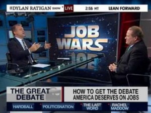 Following a bit of a dust-up during yesterday’s post-POTUS press conference coverage on MSNBC, The Ed Show host Ed Schultz appeared on Dylan Ratigan‘s The Dylan Ratigan Show to clear the air. Ratigan began by apologizing to MSNBC’s audience (for an awesome bit of television?) for distracting from an important debate, and to Schultz for interrupting him. “Both of us are not only passionate about America and jobs, but we are friends and colleagues,” Ratigan told his audience.