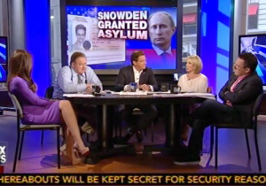 Gutfeld mocked up Snowden as a supposed “great hero” and wondered why neither he nor Greenwald have the capacity to “stand up to an actual villain like Putin” over Russia’s anti-gay laws. He and the others continued the Snowden-in-Russia bashing, while Bolling jumped in to tell his colleagues, “I am sure Russia wasn’t his first choice.” Guilfoyle still maintained, “There is no excuse for going to Russia.” Bolling shot back, “There’s really no excuse for what the NSA did as well.”