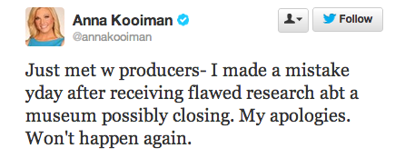 “Last weekend, we mentioned a story about the President funding a Muslim museum during the shutdown,” Kooiman said. “We made a bad mistake by reporting a story based on poor research that was not true. We apologize for not checking the facts, and for allowing the story to make air.”