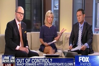 The hosts of Fox & Friends on Wednesday dug into the story of a Missouri rodeo clown who ignited a national controversy when he sported a mask of President Barack Obama and taunted bulls to attack him. The Fox News Channel hosts noted that this is not a unique level of disrespect for any president and read the reactions of a number of their viewers who identified hypocrisy and disingenuous outrage on the part of those offended by the rodeo clown.