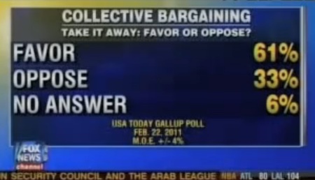 This wasn’t even the first statewide poll on the subject, and the earlier poll showed 74% opposed to ending collective bargaining. Despite transparent methodology, many chose to ignore the poll because it was commissioned by a union. Then, the Gallup poll came along and largely confirmed those results. Could Fox & Friends have missed both of those polls? Certainly, but at that point, it becomes difficult to decide which is worse, ignorance or dishonesty.