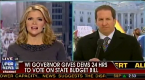 Fox News reporter Mike Tobin continues to report from Wisconsin, the site of the “unwanted touching” he received yesterday from an angry protester upset with Fox News. Megyn Kelly asked Tobin for an update, as a more peaceful protester held up a “Fake News” sign over Tobin’s shoulder in the background.