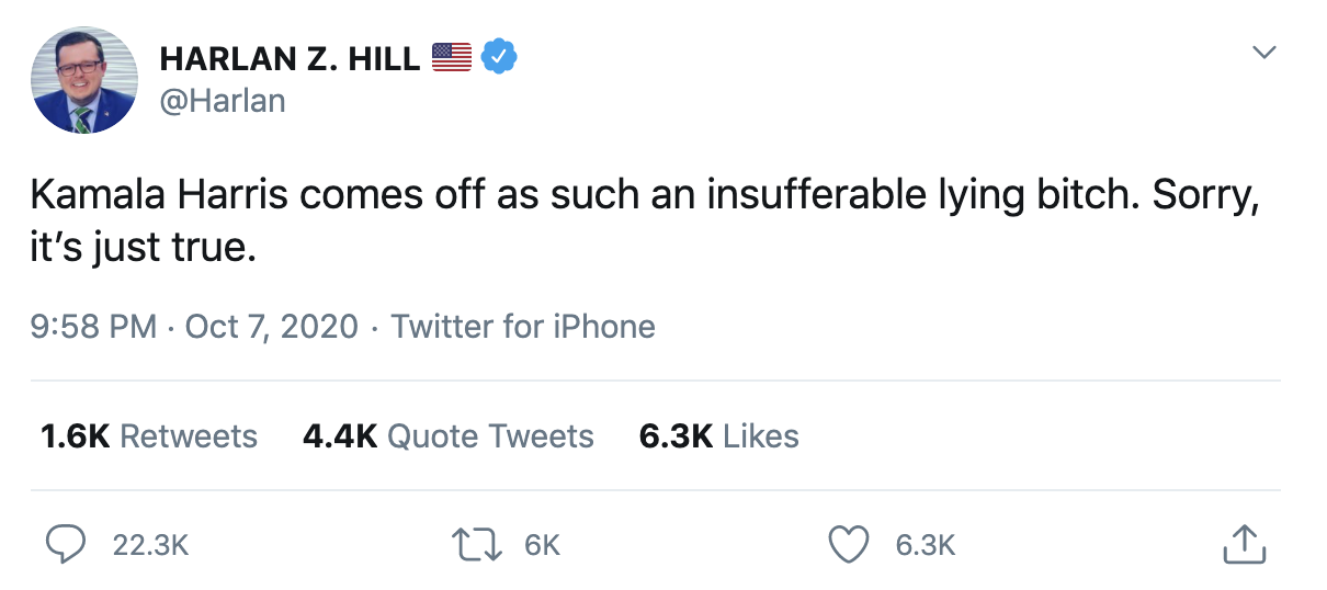“Kamala Harris comes off as such an insufferable lying bitch. Sorry, it’s just true,” tweeted Hill, an Advisory Board Member on the Trump campaign and occasional guest on Fox News.