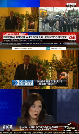 CNN and MSNBC both broke into regular programming to cover Mayor Bill de Blasio and Commissioner Bill Bratton’s eulogies for officer Wenjian Liu, and led up to the event with live commentary. Fox, however, stayed with MediaBuzz while streaming the remarks online. Below are screenshots of the three networks just after de Blasio began his remarks: