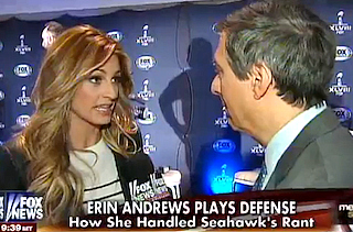 Howard Kurtz nabbed Fox Sports reporter Erin Andrews for a quick interview that aired on Fox’s Media Buzz Sunday morning. Andrews celebrated Seattle Seahawks cornerback Richard Sherman’s post-game rant against Michael Crabtree, saying that she enjoyed his spontaneous response and that the two had gotten together since to laugh at the outraged responses.