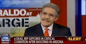 Late Saturday night, Fox News Channel’s Geraldo Rivera, discussing the Arizona Safeway shooting that left Congresswoman Gabrielle Gifford injured and six others dead with Tea Party 365 co-founder David Webb, “went there” by invoking former Alaska governor Sarah Palin. Palin’s name has been linked to reports on Saturday’s shooting thanks, in part, to the “crosshair” imagery used in her so-called “Hit List” of 20 politicians, previously posted on website “Take Back the 20.”