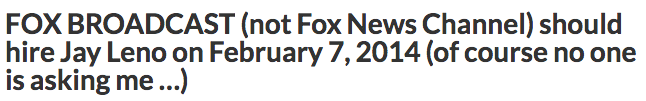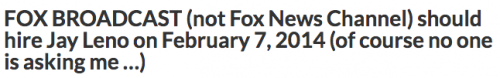 I just read that Jay Leno’s last night on THE TONIGHT SHOW is February 6, 2014. I have not followed the story about Leno and NBC very closely but I decided to dig a bit deeper when I saw the February 6th date.