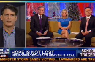The guest was neurosurgeon Dr. Eben Alexander, author of Proof of Heaven, which details his own near-death experience in which he was brain-dead for a week and saw what he calls “heaven.” He came on the Fox morning show to offer comfort to the victims’ families in the form of reassurance that their children’s souls are being cared for in heaven.