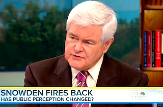 Former House speaker Newt Gingrich excoriated NSA leaker Edward Snowden on Meet the Press Sunday morning, arguing that he had set a dangerous precedent by leaking classified information about U.S. surveillance operations, and that younguns would no longer hold him in such esteem were there ever a major attack on the United States.