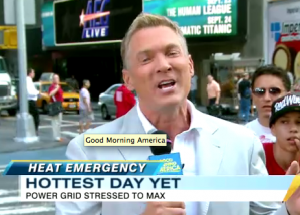 On Good Morning America, ABC’s Sam Champion warned East Coast viewers it’s not just going to be insanely hot today, but–brace yourself–you might not have air conditioning to endure the heat. Champion says the monster heat wave is pushing power grids toward capacity as temperatures hover around 100 degrees and energy consumption strains the system. It’s called a “heat dome,” a shroud of high pressure that’s keeping millions of Americans stuck in a prison of hot, humid air–and a very real possibility of power failures.
