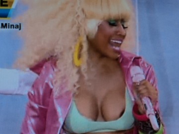 Rapper/singer Nicki Minaj paid a visit to Good Morning America and suffered a little bit of a wardrobe malfunction while singing, as might be expected when one wears a teeny tiny itty bitty little tank top held up with double-sided tape and a prayer.