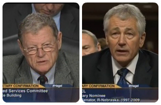 During this morning’s Senate hearings to confirm Chuck Hagel as the next Secretary of Defense, Sen. Jim Inhofe (R-OK) confronted the nominee with the reports that the Iranian Foreign Ministry is pleased with his nomination. Hagel responded with a chuckle and a suggestion that he’d be willing to address such concerns.