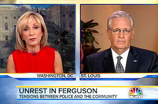 Embattled Missouri Governor Jay Nixon (D) told Meet the Press guest host Andrea Mitchell that nobody was aware the police would release surveillance footage reportedly showing Michael Brown robbing a convenience store before he was shot, and that he “disagreed deeply” with the decision. Both Nixon and Mitchell agreed that the footage rekindled tensions that had died down after the replacement of local police with highway patrol.