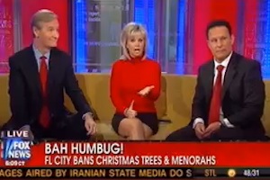 On Friday’s Fox and Friends, the three defenders of the Yuletide were lamenting yet another alleged assault on Christmas, when Gretchen Carlson speculated it was only a matter of time before local authorities forced residents to have to take down their own decorations. Co-host Brian Kilmeade was reading a viewer email that said if “you and your children want to see Christmas displayed, put one up in your own yard. Nobody’s stopping you.” “Well at least not yet!” Carlson exclaimed, spurring off-camera chuckles. “Just wait for the town ordinance when you can’t have it!”