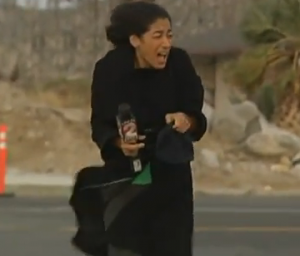 Intrepid reporter Marissa Mike reporting in Palm Springs, California is willing to brave the elements to deliver news to her viewers. Even if it takes over twenty times to get it right and even if she is required to chase around her news hat as the strong winds repeatedly blow it off of her head.