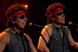 The first time Bruce Springsteen donned his vintage beard and sunglasses on Late Night it was for a duet with Jimmy Fallon’s Neil Young on Willow Smith’s “Whip My Hair.” Tonight he came back one more time before Fallon heads to the Tonight Show, this time to perform a new version of his own “Born to Run” dedicated to Governor Chris Christie’s “Fort Lee, New Jersey traffic jam.”