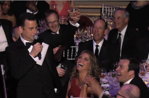Kimmel saved some very kind words for Jimmy Fallon, who was feeding him a variety of alcoholic beverages throughout the toast. “Jimmy’s probably a bigger influence on me than anyone in this room, because he’s so talented and energetic that he forces me to be the best that I can be.” Teasing the new dynamic the will begin when Fallon takes over the Tonight Show and goes head-to-head with Kimmel at 11:35pm, he said, “Quite frankly, it’s a pain in the ass. I’d appreciate it if you’d slow down a little. But I love him, and I want to toast my future rival, Jimmy Fallon, who’s getting me very, very drunk.”