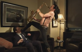 hotness but his equally impressive penchant for goofiness and hilarity. This SNL digital short perfectly marries the two, with the added bonus of Andy Samberg getting to thumb his nose at the haters. Even though if he’d have loved to have played Sergio, but as a rapper on a boat. Peep Hamm’s pecs below, then read on for some smarty-pants film references and more sweaty glistening hunky beefcake saxaphone-playing.