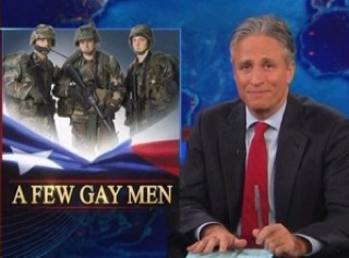 After a bizarre detour into Emmy land after a particularly bad Bill Clinton joke, Stewart ended his segment with the most moving video of the day– that of a soldier calling his father today to come out as gay, highlighting the one area where the repeal had the most impact.