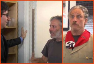 Stewart appeared in a series of ridiculous get-ups from Tea Party redneck to over-the-top Jewish stereotype to full-on Nazi before Colbert entered his dressing room in a hazmat suit to clean up the mess.