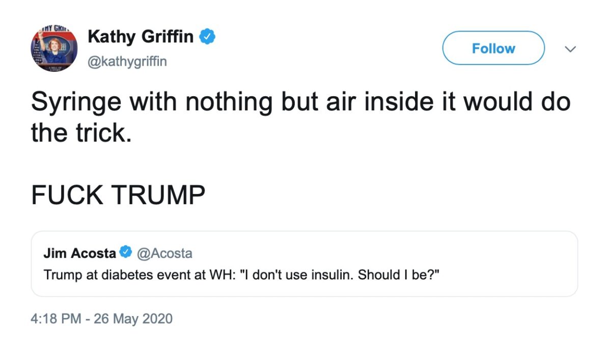 On Tuesday night, Griffin posted her proposal against the backdrop of Trump’s remarks from a White House press conference on senior citizens suffering diabetes. At one point in the news conference, Trump said: “I don’t use insulin. Should I be?”