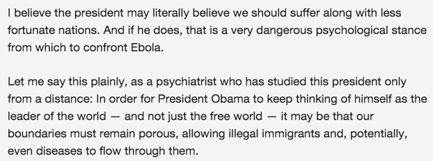 As with any federal response to tragic situations, there’s certainly criticisms to be made, but reliable ol’ Ablow takes it to that especially slimy, cartoonish degree in a fear-mongering column titled “Why Obama is allowing Ebolaphobia to spread”: