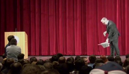 Former Countdown host Keith Olbermann followed his speech at Tuesday’s “An Evening with Keith Olbermann” with a 42-minute Q&A session at Cornelll University’s Bailey Hall. He began the segment with a bit of performance art, publicly desecrating a copy of the Ann Coulter-founded Cornell Review, literally mopping the floor with the paper. However, in a possible sign of peace in our time, he later shook hands with Ephram Smith, the Cornell Review writer whose article got the Swiffer™ treatment.
