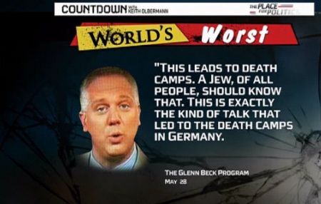 Immediately after thoroughly dressing down CNN’s Campbell Brown on last night’s Countdown, Keith Olbermann set his sights on popular Worst Persons fixture Glenn Beck, and he couldn’t have asked for an easier layup. Beck committed his umteen-zillionth violation of Godwin’s Law, this time aiming his Nazi comparison at a particularly poorly-chosen target. Olbermann executes the takedown perfectly, but blows it on the dismount with a petty, snarky reference to Beck’s struggles with alcoholism.