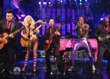 In her first appearance as Saturday Night Live host, but third as musical guest on the sketch show, fans of pop star Lady Gaga got lots of bonus Gaga, as the dance diva did a musical number in her monologue, a Madonna “cover” in another sketch, and opened her musical-guesting duties with a groovy rendition of her new hit Do What U Want, from her just-released ARTPOP album. She finished up her stint as musical guest by performing Gypsy, also from her new album, in a butterfly-inspired getup.