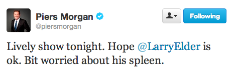 Piers Morgan clearly has no qualms about inviting people on his show who fiercely disagree with him or even attack him personally, and tonight’s opening interview with radio host Larry Elder did not disappoint. Elder told Morgan his interview with George Zimmerman trial witness Rachel Jeantel was horrendous and “condescending,” and even told Morgan that he was being “stupid” for his assessment of Jeantel’s character.