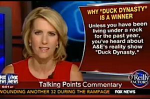 Filling in for Bill O’Reilly Friday night, Laura Ingraham opened The O’Reilly Factor with a monologue explaining why she thinks A&E’s Duck Dynasty scored the highest ever ratings for a reality TV show with its premiere this week.