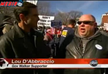 Finally, in the most comical part of this report, Woodruff says that D’Abbraccio “got an earful from the pro-labor crowd,” then shows a clip of the GOP official wading into the crowd (which is ignoring him) bleating “We won! Deal with it!”